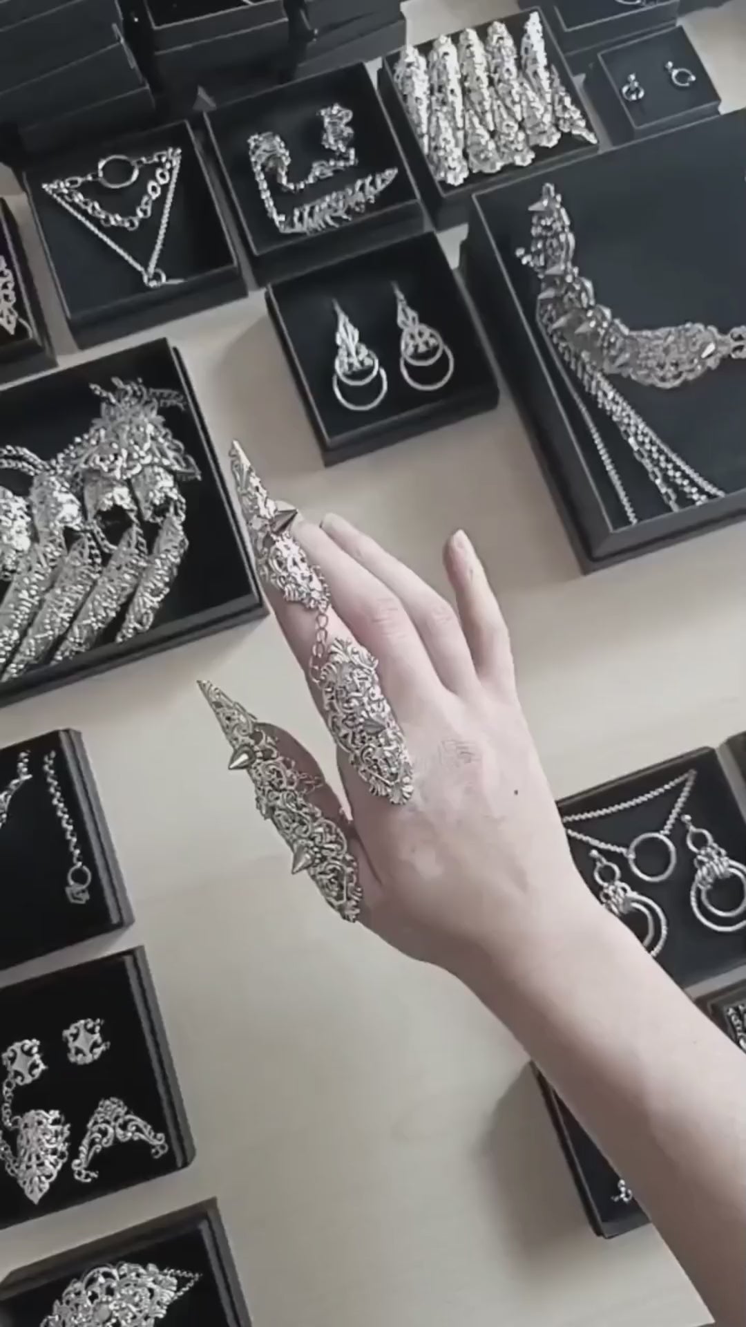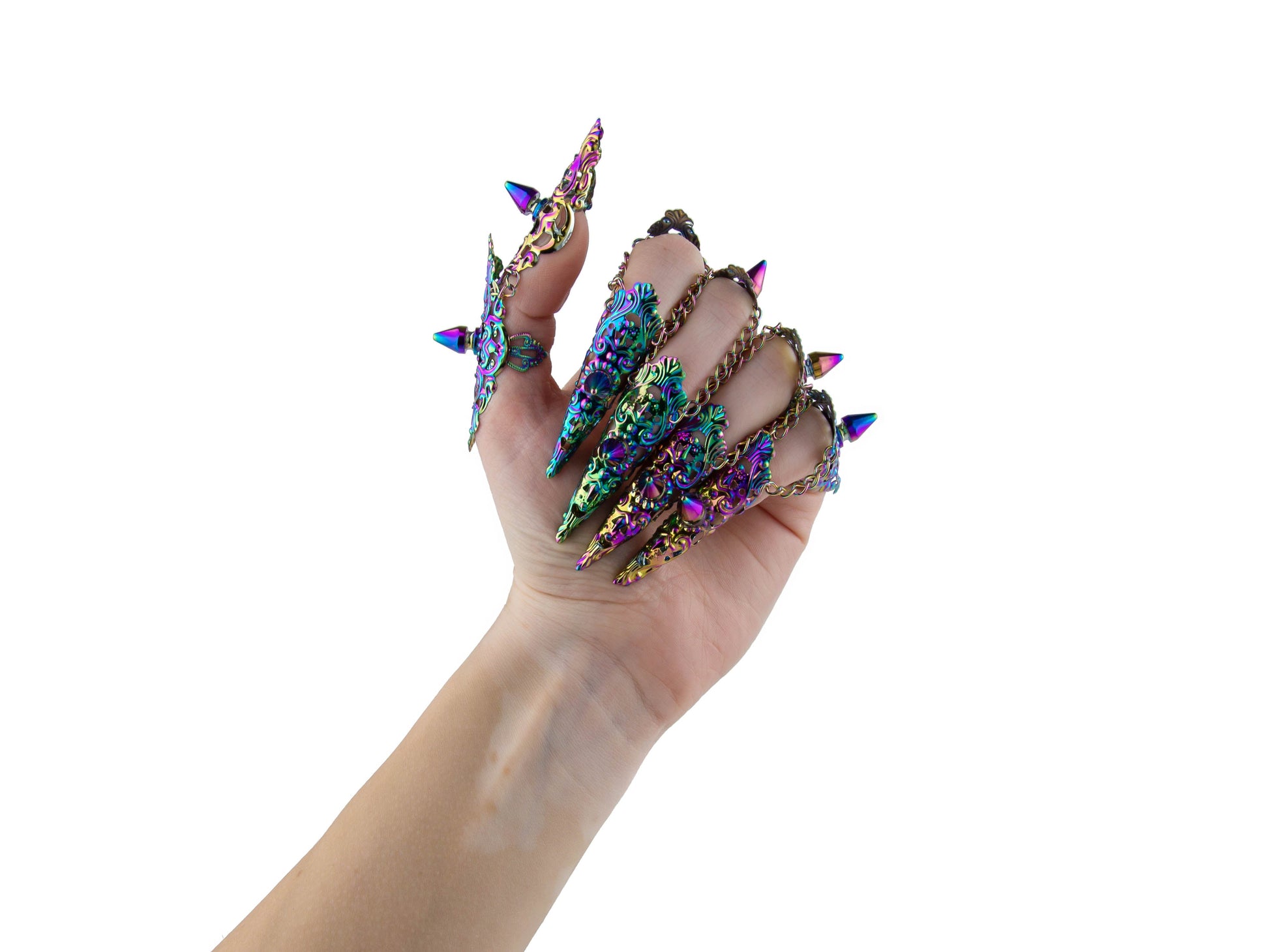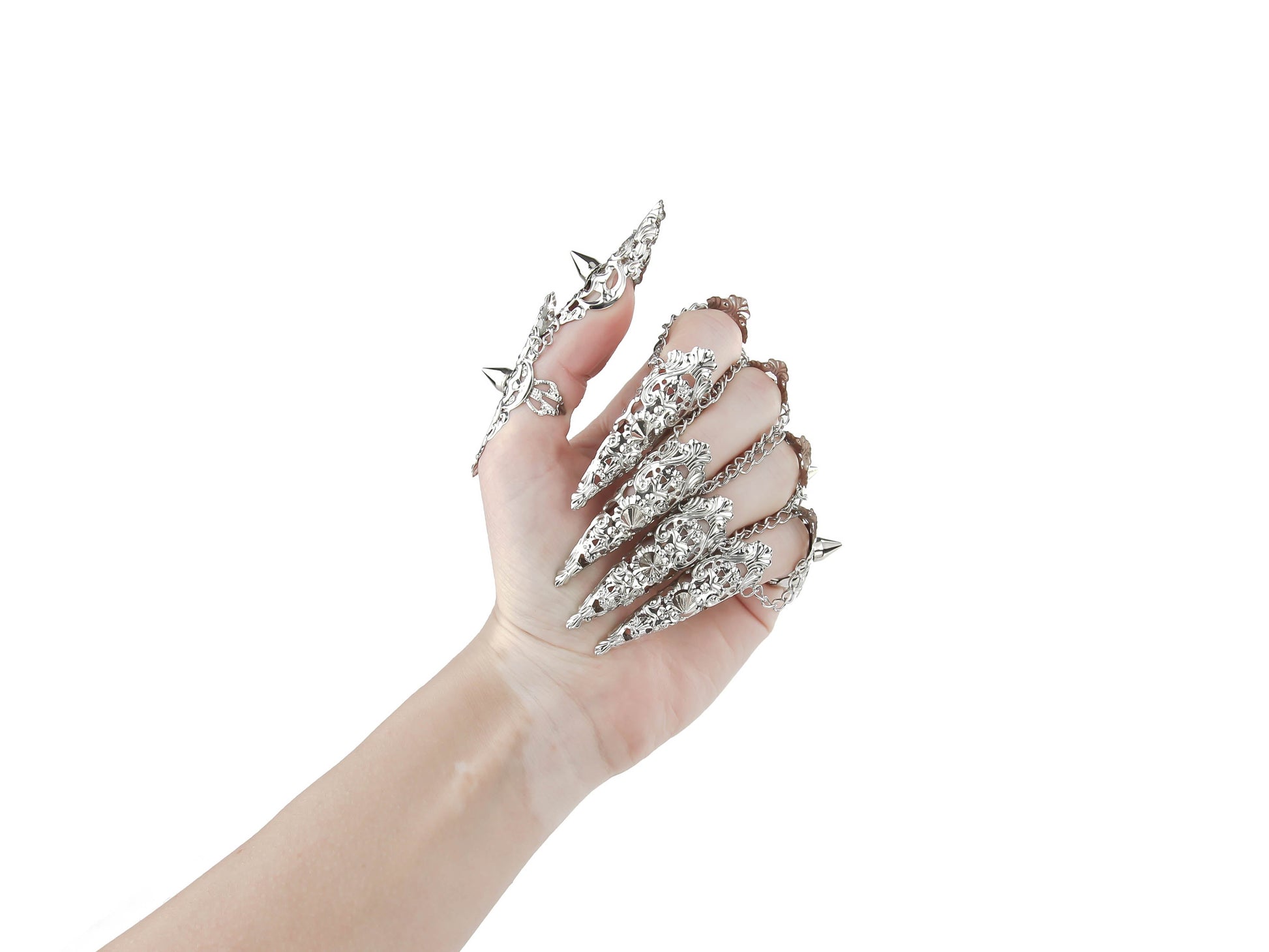 Step into the shadowy elegance of Myril Jewels' full hand set of studded nail claw rings, a quintessential neo-goth treasure for the dark fashion enthusiast. Perfect for Halloween and all avant-garde occasions.